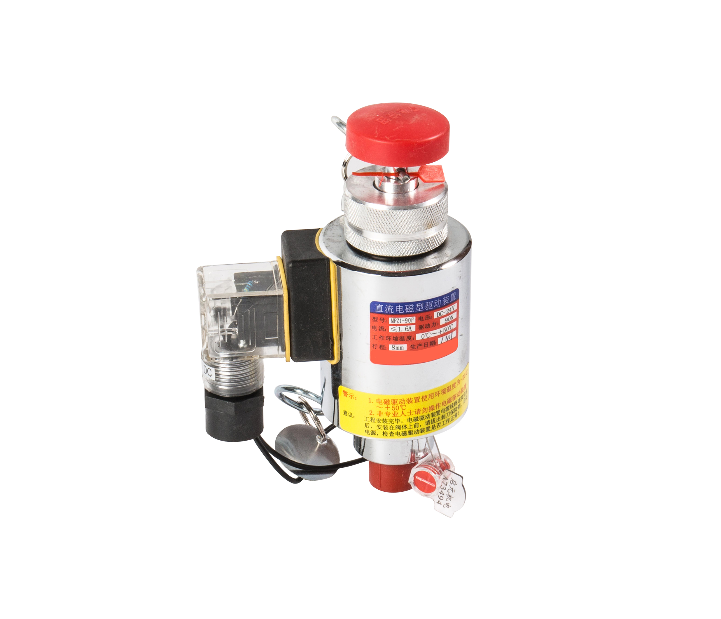 電磁驅(qū)動(dòng)裝置安裝在容器閥上,電磁鐵動(dòng)作時(shí)擊穿裝置刺破容器閥上的密封膜片,使滅火劑釋放。電磁驅(qū)動(dòng)裝置具有機(jī)械應(yīng)急啟動(dòng)功能,進(jìn)行應(yīng)急啟動(dòng)時(shí),首先應(yīng)拔出機(jī)械應(yīng)急保險(xiǎn)銷(xiāo),用力按下機(jī)械應(yīng)急啟動(dòng)裝置,即可實(shí)現(xiàn)應(yīng)急啟動(dòng)。